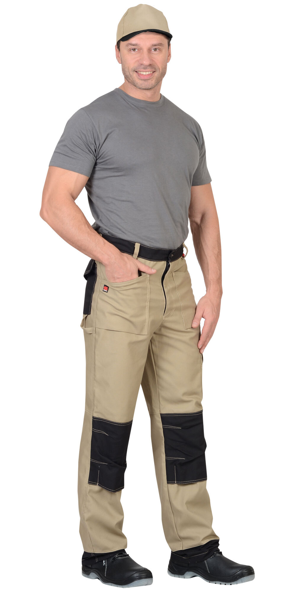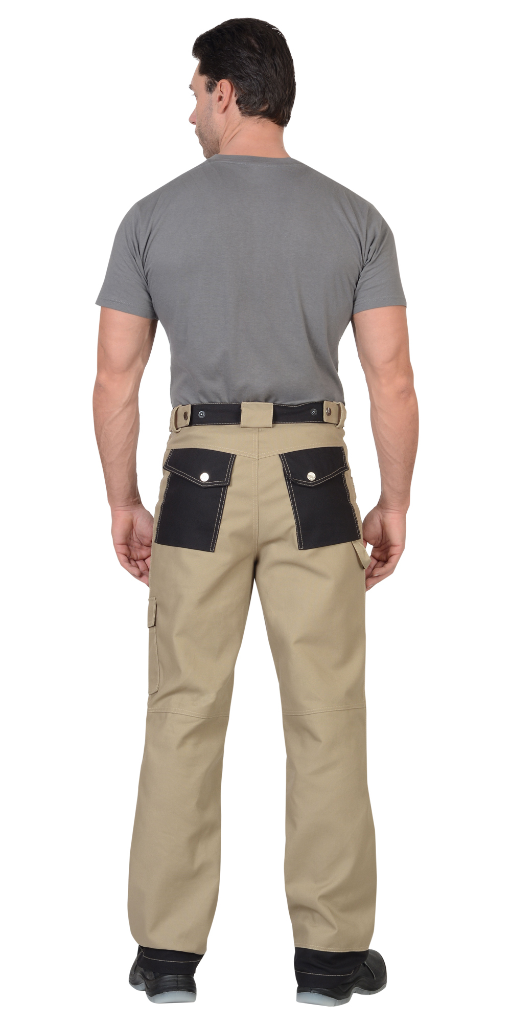 Брюки с притачным поясом, застегивающимся на джинсовую пуговицу и с регулировкой ширины пояса при помощи пат и кнопок, с накладными карманами и объемными наколенниками с возможностью вставить в них объемные щитки