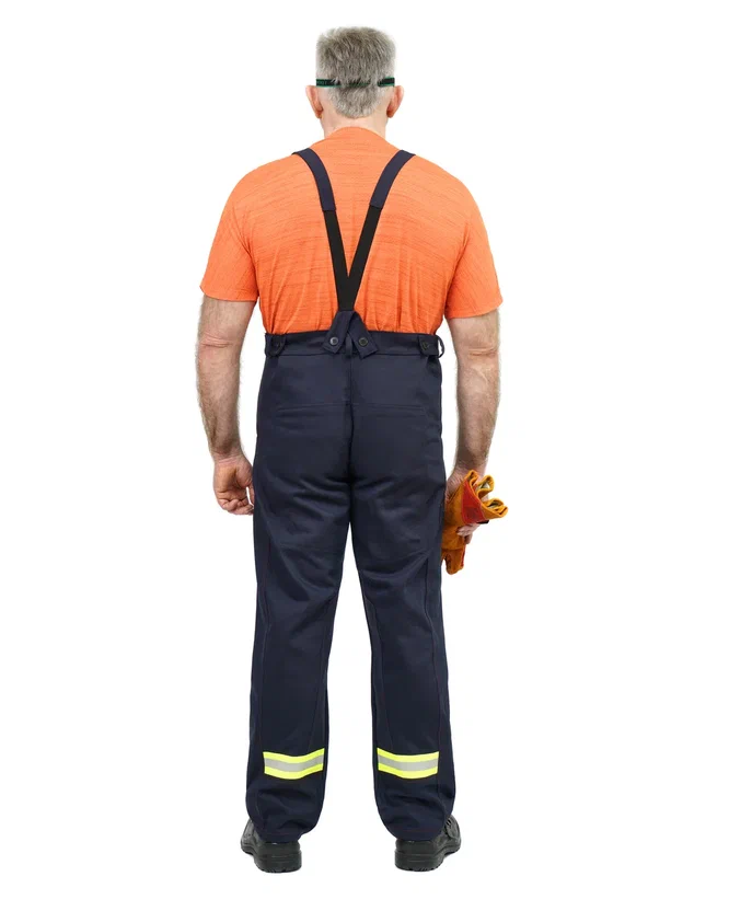 В брюках имеются накладки. На передних половинках брюк высота накладок от начала шагового шва и до низа брюк. На задних половинках брюк накладки располагаются по верху и низу , боковым и шаговым швам. В верхней части задних половинок брюк настрачиваются фигурные накладки ш. В брюках на задних половинках имеются нижняя накладкам, шаговая накладка , а так же боковая накладка. По низу брюк проходит СОП 50 мм из огнестойкого материала.