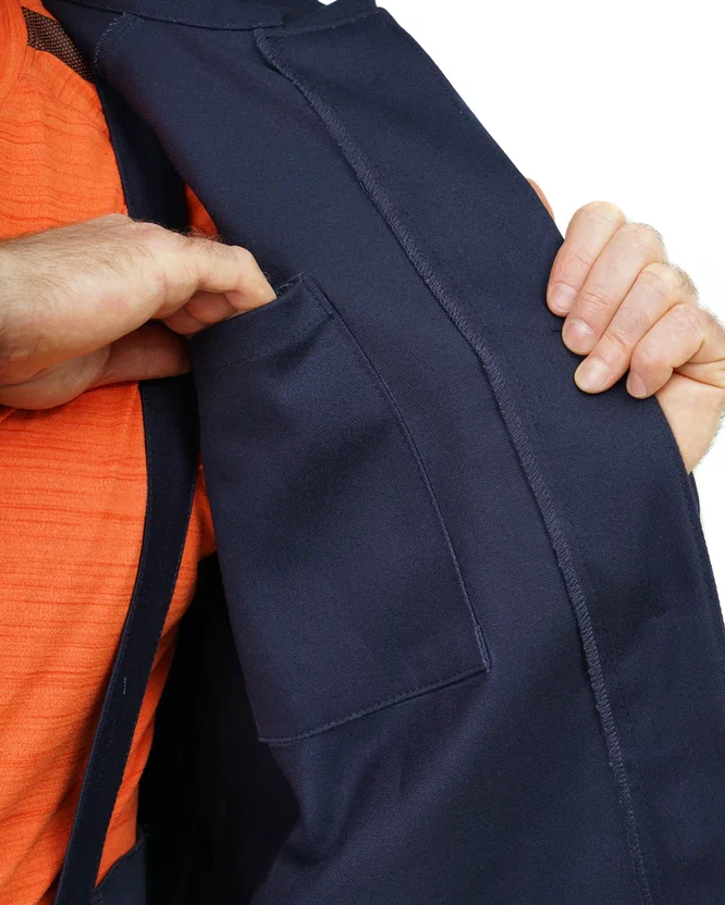 Куртка прямого силуэта, с правосторонней центральной бортовой супатной застежкой на 6 пуговиц С дополнительным внутренним защитным клапаном из основного материала, предохраняющим от попадания искр внутрь.