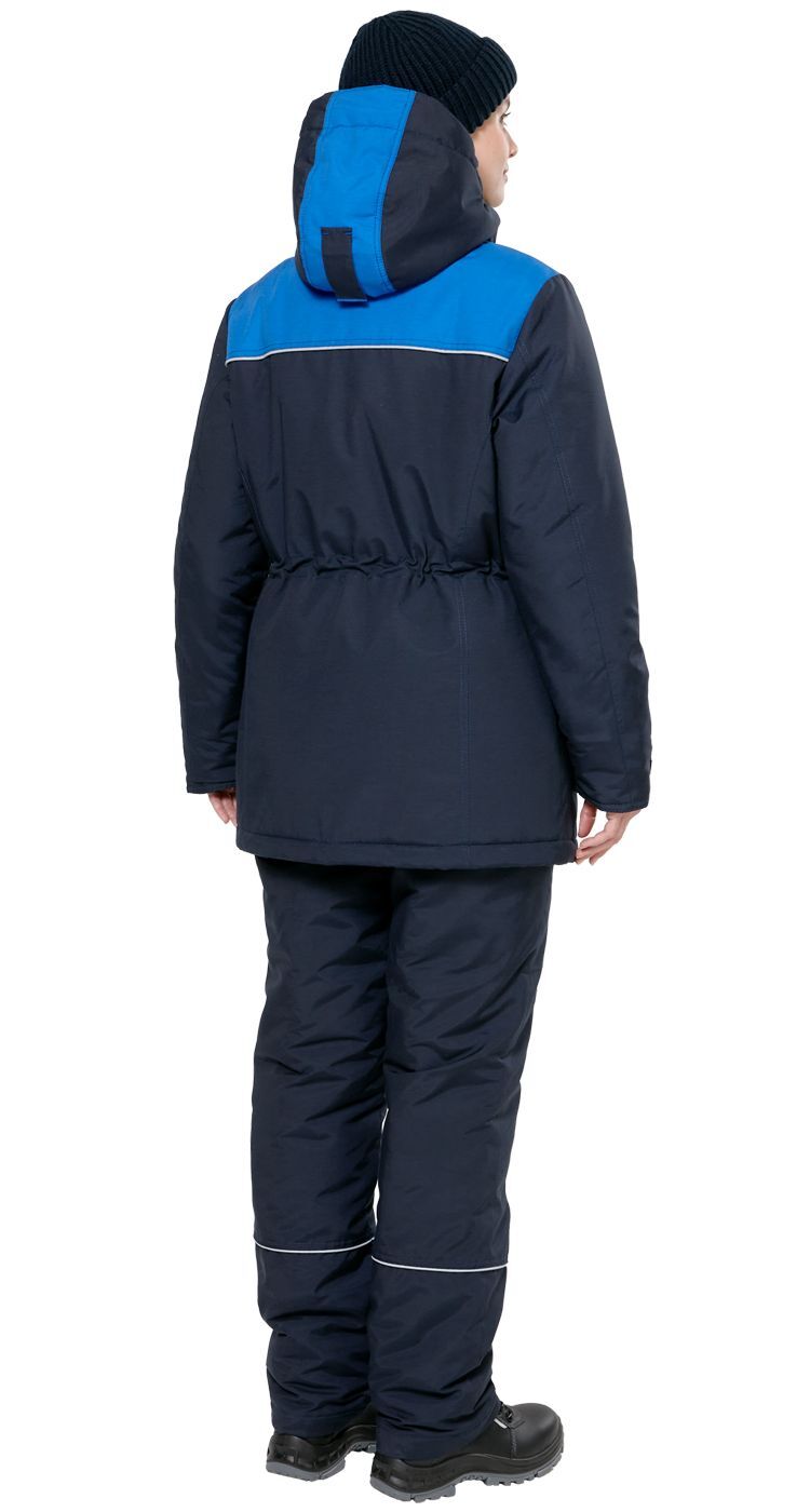 По низу кокеток куртки зимнего женского костюма и в нижней части полукомбинезона расположены световозвращающие канты для безопасной работы в условиях плохой видимости.