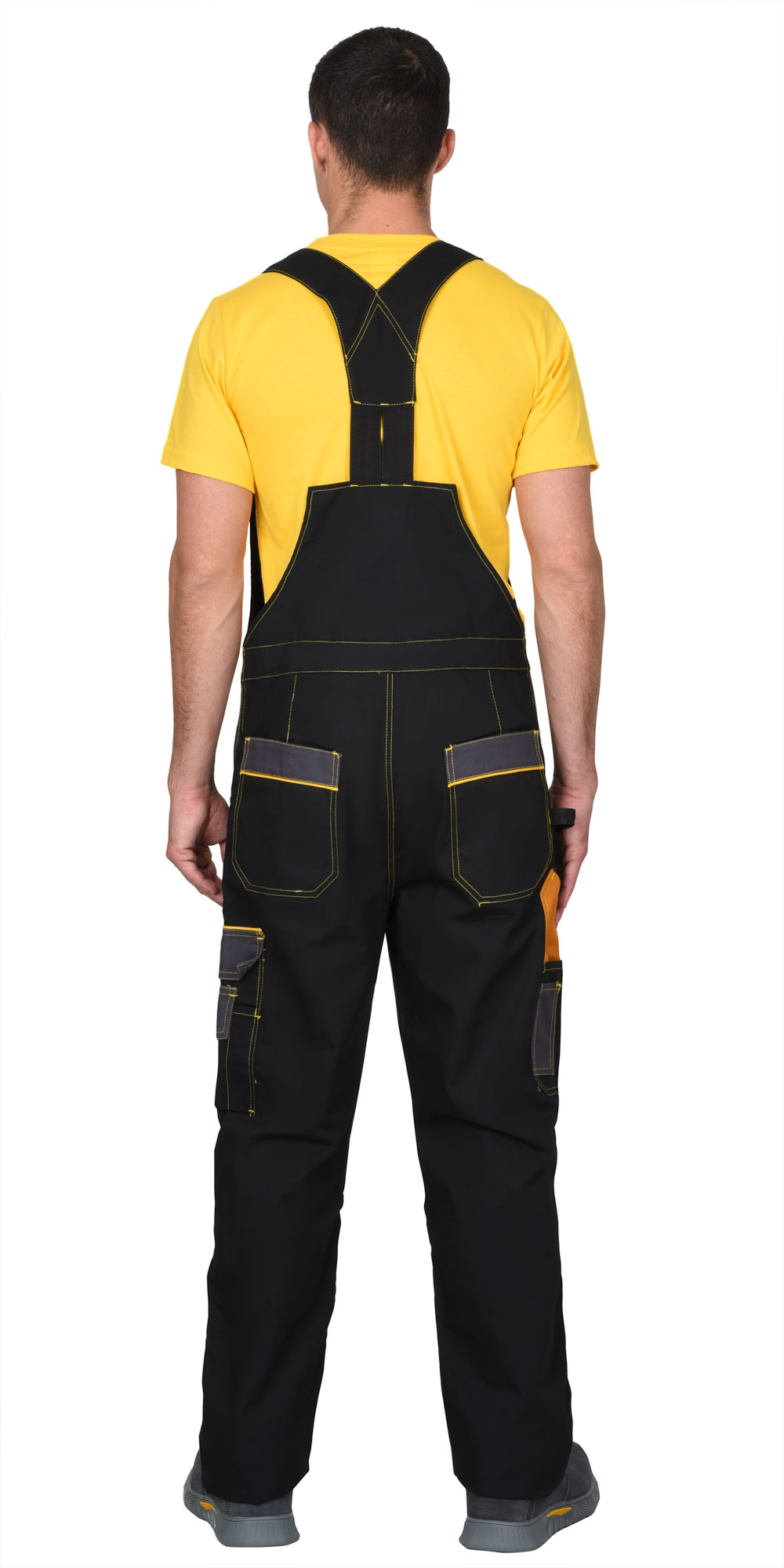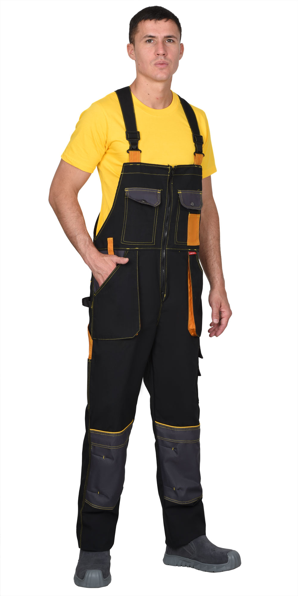 Полукомбинезон прямой с застёжкой спереди на молнию, с отрезной грудкой и отрезной спинкой, с бретелями. Полукомбинезон с накладными карманами спереди, сзади и на боковых швах, с объёмными наколенниками из плотной, непромокаемой ткани с верхним входом для амортизационного вкладыша. Бретели регулируются при помощи застежек-фастексов и резинки.